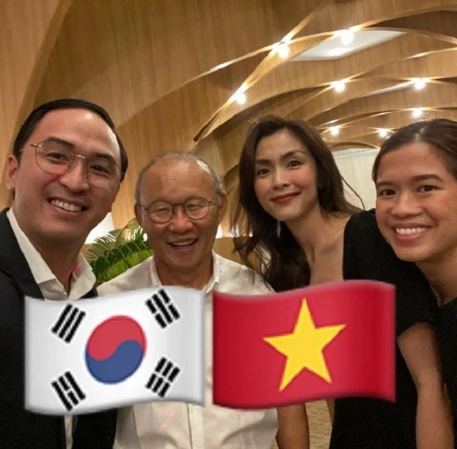 Trên trang cá nhân của chồng Tăng Thanh Hà chia sẻ khoảnh khắc chung của hai vợ chồng với HLV Park Hang-seo tại một sự kiện tối 27-12.