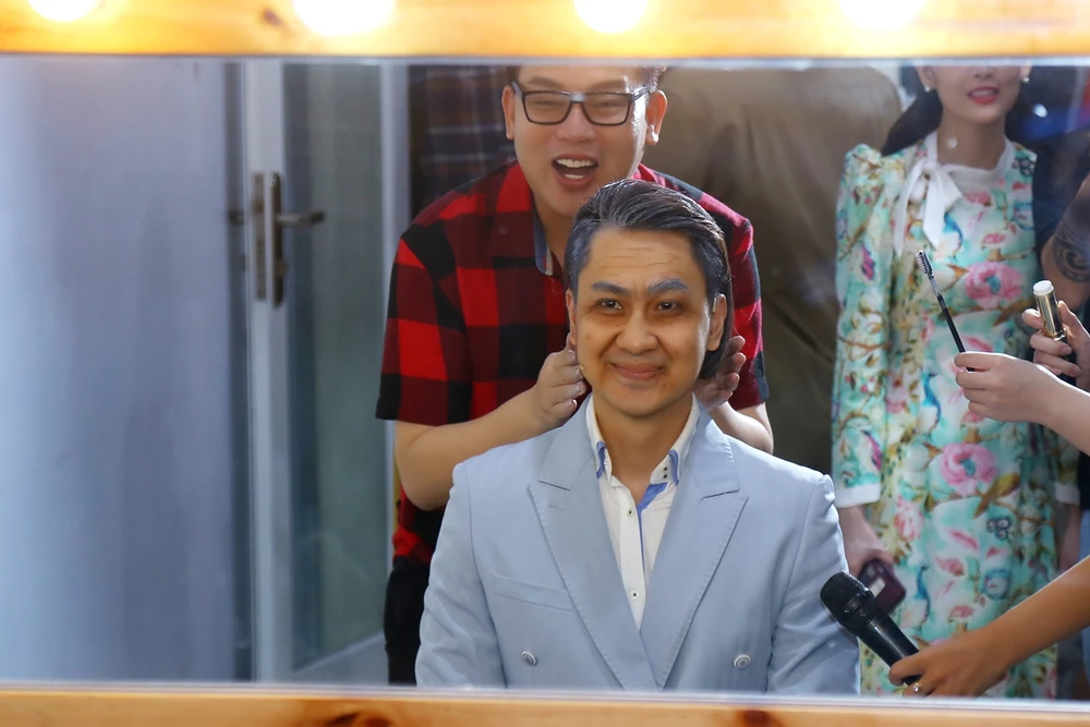 Nhạc sĩ Phan Hồng Hà (trái) và Tùng Lâm hóa thân nhạc sĩ Phan Huỳnh Điểu khi ông 90 tuổi với đầu bạc trắng. Ảnh: JET
