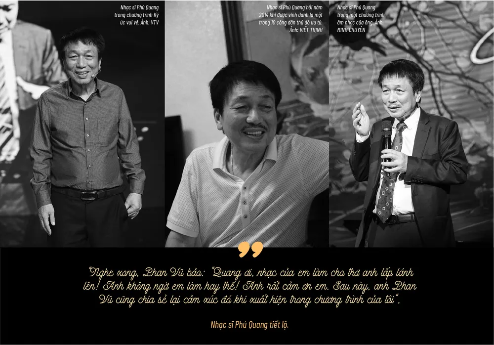 Trong chương trình, MC Quyền Linh đã vui mừng nhắc về những kỷ niệm đáng nhớ. Anh kể, lần ấy ghé thăm nhà nhạc sĩ Phú Quang, anh được đón tiếp như một người thân trong gia đình. Đặc biệt, anh còn được nghe nhạc sĩ Phú Quang đàn và hát ngay tại nhà. Khi được Quyền Linh nhắc về bản nhạc nổi tiếng Chiều đông Moscow, nhạc sĩ Phú Quang nghẹn ngào kể câu chuyện phía sau sáng tác ấy khiến nhiều người xúc động. Nhạc sĩ cho biết, năm đó ông có chuyến đi Moscow, được dịp tham quan một khu chợ trời, ghé lại mua hàng của một người Việt sang đây sinh sống.