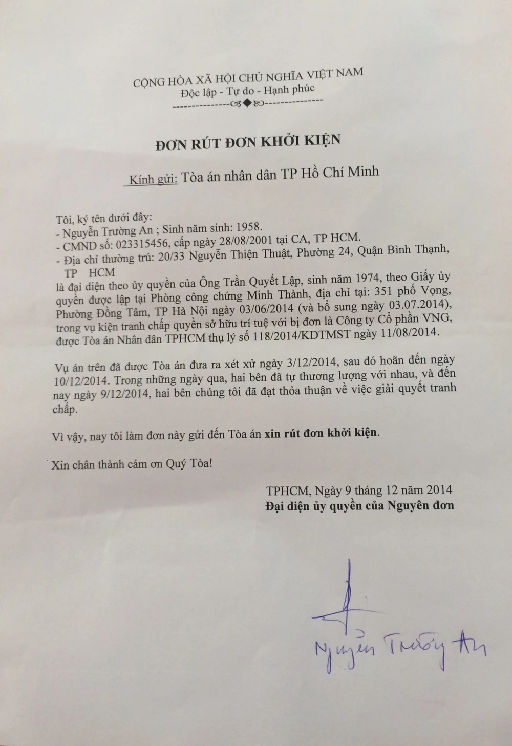 Diễn biến mới nhất tại phiên xử, đại diện ủy quyền của nhạc sĩ Trần Lập đã có đơn xin rút lại toàn bộ yêu cầu khởi kiện. Phía VNG cũng đồng ý với việc rút đơn khởi kiện của nguyên đơn. Từ đó, HĐXX ra quyết định chấp nhận việc tự nguyện rút đơn khởi kiện của phía nguyên đơn đình chỉ vụ án này.