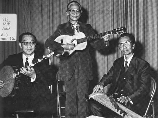 GS Trần Văn Khê, nhạc sĩ Phạm Duy và nhạc sư Vĩnh Bảo (từ trái sang) trong một buổi trình diễn tại Hoa Kỳ tháng 11-1971.