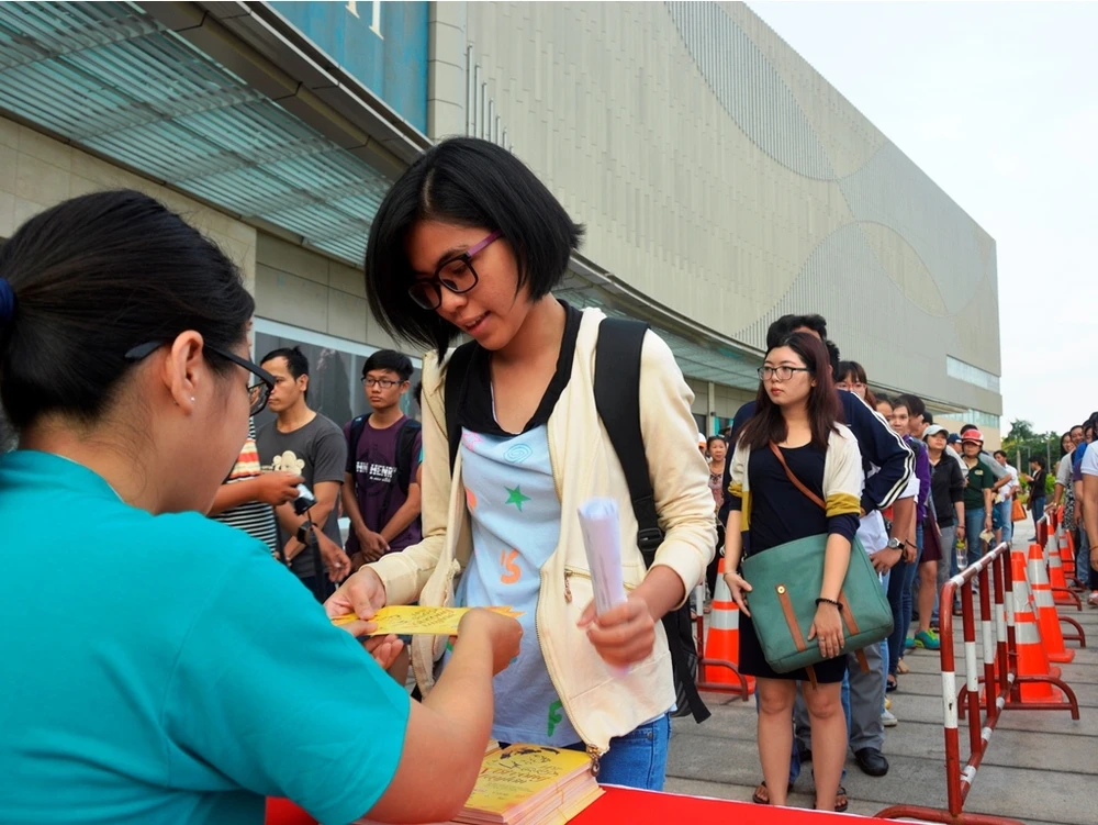 Toàn bộ vé mời của đêm nhạc Trịnh 2016 sẽ được phát miễn phí vào 7 giờ ngày 15-4, tại Trung tâm thương mại Crescent Mall (Khu đô thị Phú Mỹ Hưng, quận 7, TP.HCM). Trong ảnh: Khán giả nhận vé mời trong chương trình năm 2015 - Ảnh: BTC