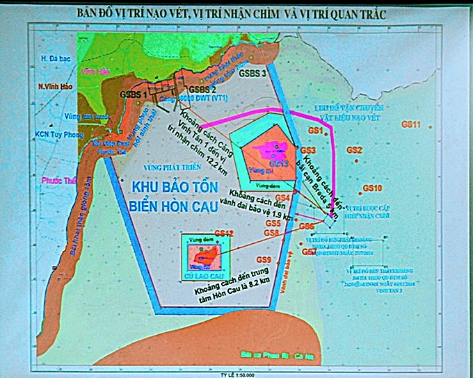Bản đồ vị trí nhận chìm khối chất nạo vét khổng lồ xuống vùng biển Tuy Phong.