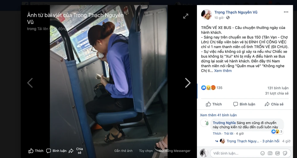 "Khách lên xuống trạm liên tục, chị ấy luôn nhắc rằng "Còn ai chưa mua vé không ạ? Mua vé giùm em nha!"... Nhưng chỉ vì một câu "quên mua vé" của nam thanh niên mà chị tiếp viên bị quy vào lỗi gian lận về quy định bán vé và cuối cùng bị đuổi. Chị ấy trách nam thanh niên: "Sao tôi kêu to như vậy mà anh không nghe. Anh làm người khác phải mất việc rồi anh thấy chưa", rồi chị ôm mặt khóc nức nở” - anh Trọng Thạch Nguyên Vũ kể chuyện.