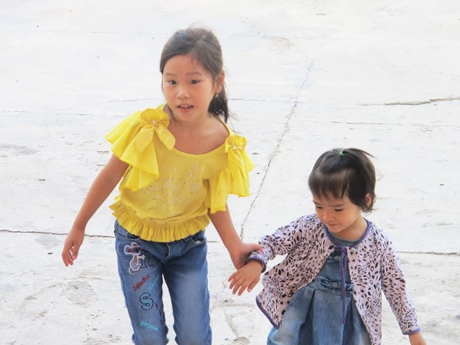 Hai cháu bé con của nạn nhân Ngô Thanh Kiều dìu nhau đến tòa án . Ảnh: Tấn Lộc