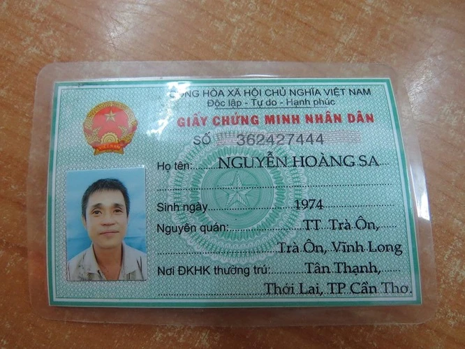 Chứng minh nhân dân của anh Nguyễn Hoàng Sa, có cha là trung sĩ Nguyễn Thành Trọng hi sinh trên chiến hạm Nhật Tảo (HQ10) vào 19-1-1974.