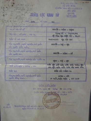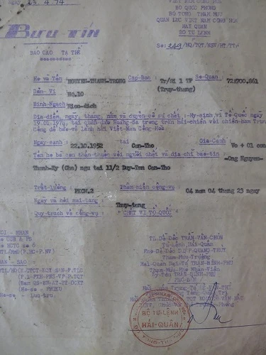 Giấy báo tử cho gia đình ông Nguyễn Thành Trọng sau trận hải chiến Hoàng Sa với hải quân Trung Quốc