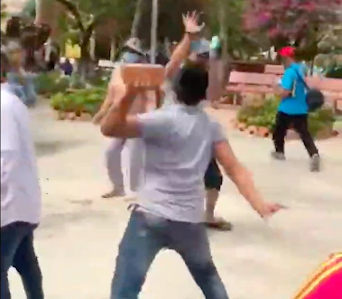Một đối tượng dùng gạch tấn công nạn nhân. (Ảnh cắt từ clip)