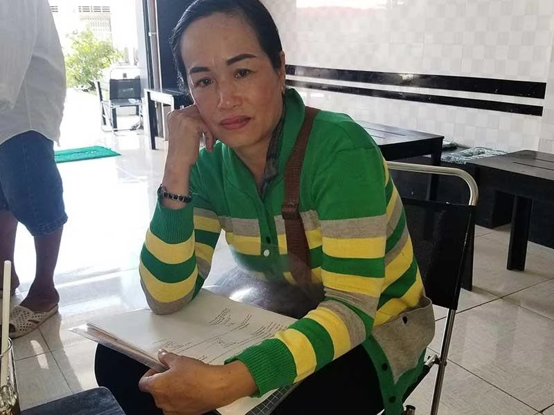 Vợ ông Bùi Thanh Phong bên chồng hồ sơ vụ việc. Ảnh: TRẦN VŨ