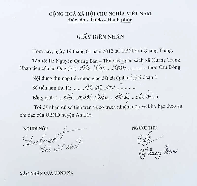 Giấy biên nhận người dân nộp tạm ứng tiền giao đất tái định cư. Theo huyện An Lão, số tiền này bị VIDIFI “tạm giữ” từ nhiều năm qua.
