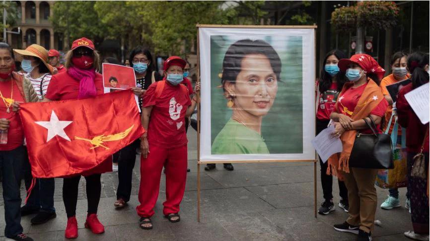 Người Myanmar mang cờ đảng Liên minh quốc gia vì dân chủ và ảnh bà Aung San Suu Kyi biểu tình ở Sydney (Úc) ngày 3-2, phản đối cuộc chính biến do quân đội Myanmar tiến hành. Ảnh: GETTY IMAGES