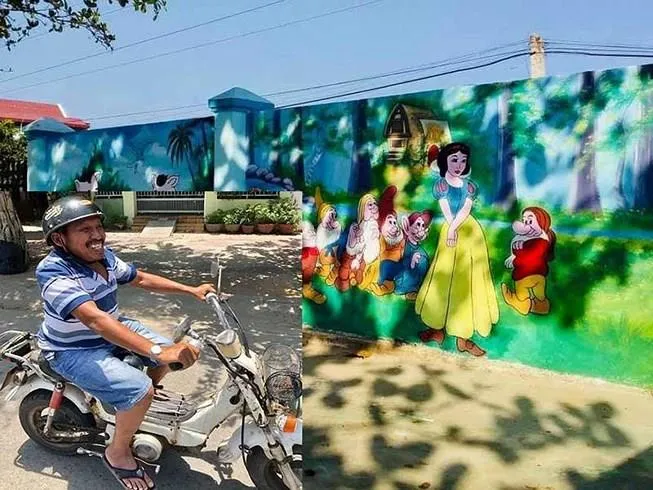 Anh Nhân "gù" bên chiếc xe Chaly cũ, tài sản đáng giá nhất của anh và bức tranh tường anh mới vẽ. Ảnh: ĐH