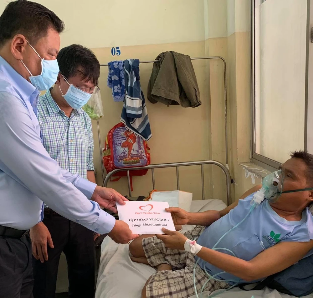 Đại diện Quỹ Thiện Tâm và Báo Pháp Luật TP.HCM trao hỗ trợ cho anh Nhân. Ảnh: TV