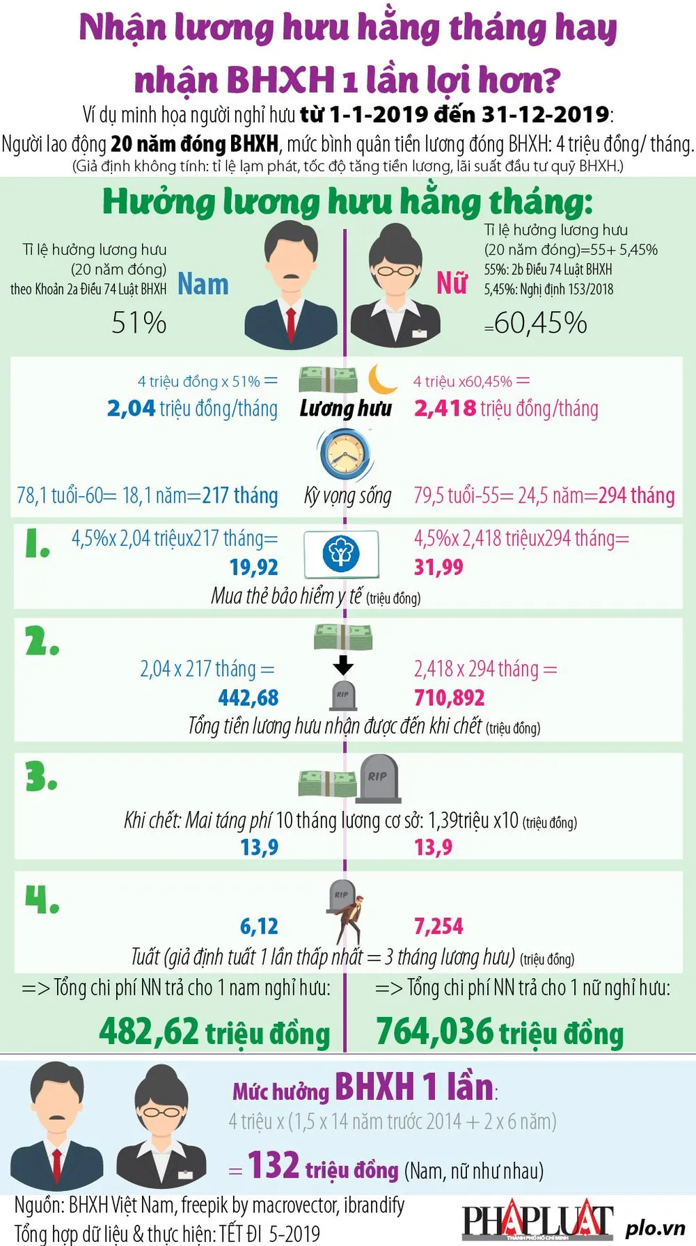 (PLO)- Từ ngày 1-1-2019, việc tính mức lương hưu hằng tháng đối với lao động nam, nữ sẽ có một số thay đổi cho phù hợp với Điều 74 Luật bảo hiểm xã hội 2014 và Nghị định 153/2018. Dưới đây là ví dụ minh họa so sánh lợi ích khi nhận lương hưu hằng tháng khi nghỉ hưu trong năm 2019.