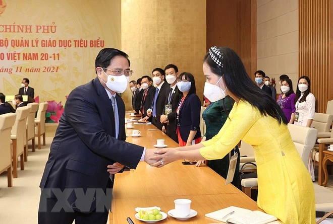 Thủ tướng Phạm Minh Chính gặp mặt trực tiếp đại diện các nhà giáo từ mọi miền Tổ quốc tại Văn phòng Chính phủ nhân Ngày Nhà giáo Việt Nam 20-11-2021. Ảnh: TTXVN