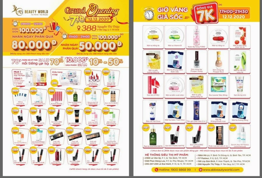 Riêng siêu thị tại quận 7, ngày khai trương còn hứa hẹn sẽ “bùng nổ” với tiết mục bán hàng đồng giá 7.000 đồng hàng trăm sản phẩm xịn từ mặt nạ dưỡng da, gel rửa tay khô, nước tẩy trang Pond, tắm gội Clear Man, son tint A Pieu, sữa rửa mặt Dove, sơn móng tay Prosper… Sau ngày khai trương, từ 18-20 giờ ngày 13-12, khách hàng tại chi nhánh 7 AB Beauty World còn được thưởng thức đêm nhạc sôi động của Chi Pu, ca sĩ nổi tiếng được nhiều người yêu mến hiện nay.