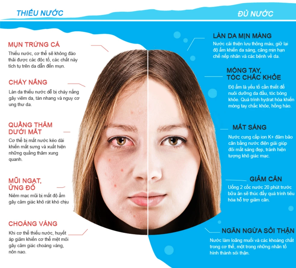 Thiếu nước, độc tố trong cơ thể không đào thải được mà tích tụ trên da dẫn đến mụn, theo Medical Plus.
