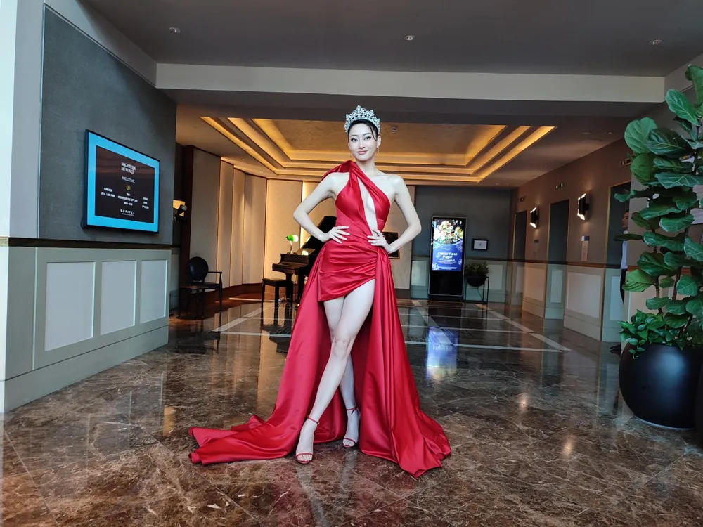 Hoa hậu Lương Thuỳ Linh trong thiết kế cắt xẻ táo bạo khoe đôi chân dài trứ danh. Ảnh: TIỂU VI