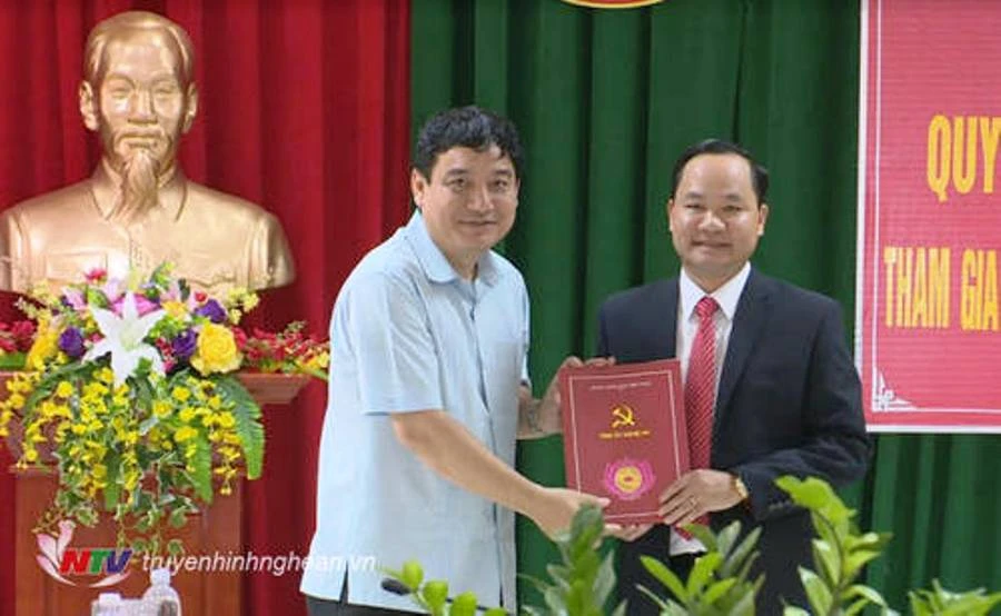Ông Nguyễn Đắc Vinh - Bí thư Tỉnh ủy Nghệ An trao quyết định bổ nhiệm ông Hoàng Quốc Việt. Ảnh: Truyền hình Nghệ An.