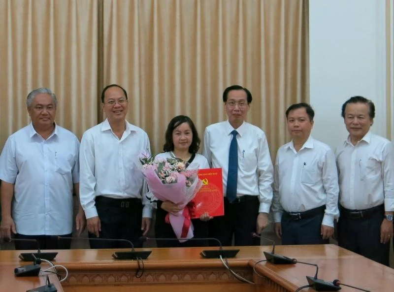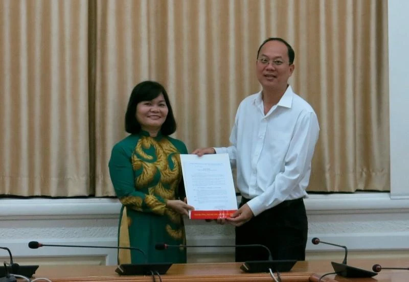 Bà Nguyễn Thụy Tường Linh nhận quyết định và hoa chúc mừng của lãnh đạo TP.HCM. Ảnh: PHƯƠNG THÙY