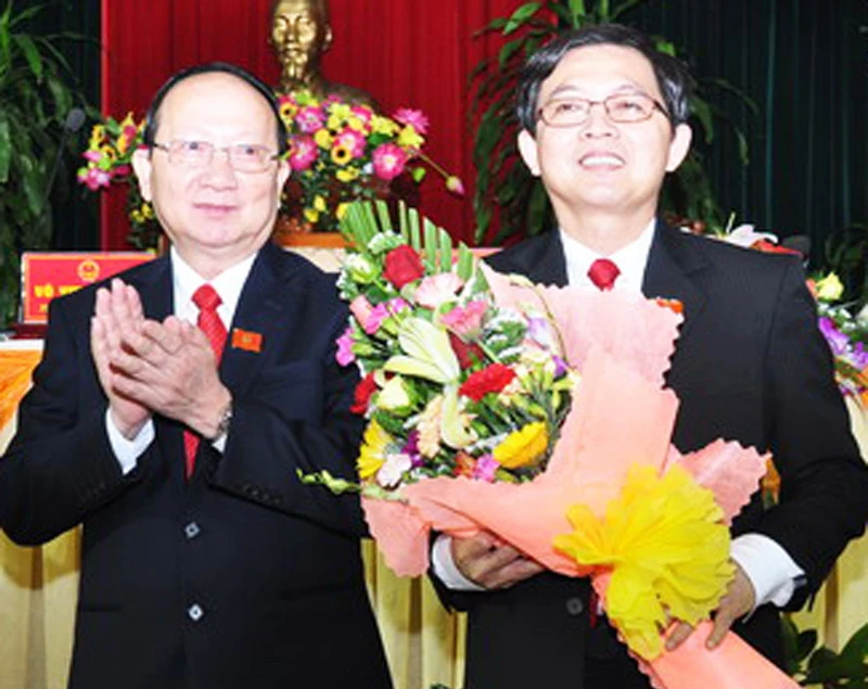 Nguyên Chủ tịch UBND tỉnh Bình Định tặng hoa chúc mừng tân Chủ tịch UBND tỉnh Hồ Quốc Dũng. Ảnh: VĂN LƯU