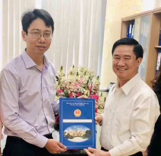 Ông Huỳnh Văn Hạnh, giám đốc Sở Tư pháp TP.HCM (phải) trao quyết định bổ nhiệm Trưởng phòng tổ chức cho ông Trần Đức Toàn. Ảnh: N.Q