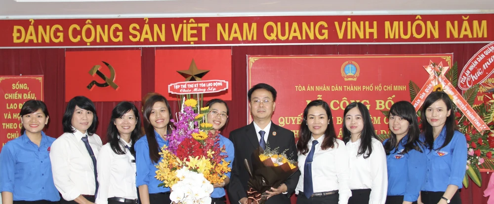 Tòa Lao động TAND TP.HCM tặng hoa chúc mừng tân Chánh án quận 1 Nguyễn Thành Vinh.