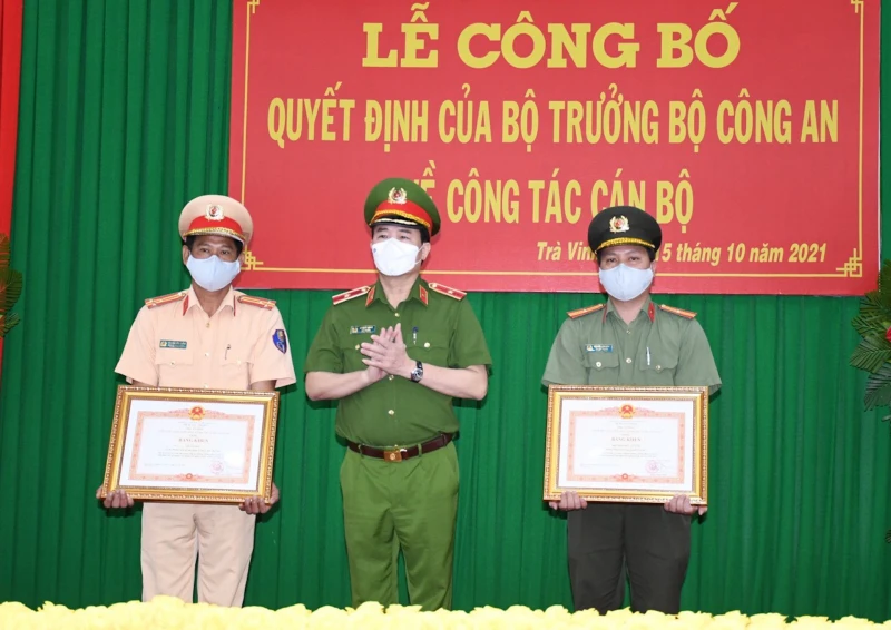 Thứ trưởng Lê Quốc Hùng trao Bằng khen của Bộ Công an cho tập thể và cá nhân có thành tích xuất sắc thuộc Công an tỉnh Trà Vinh. Ảnh: HỒ GIANG