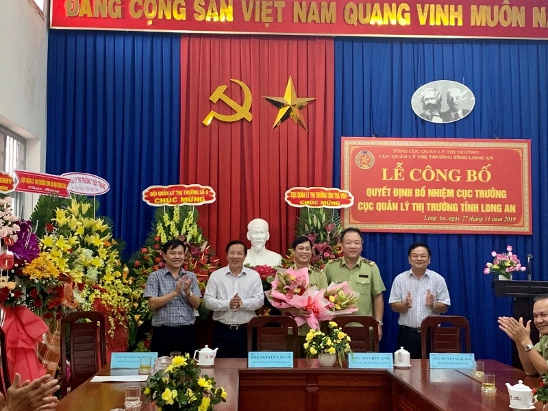 Ông Trần Hữu Linh, Tổng cục trưởng Tổng cục QLTT, chúc mừng ông Phạm Đức Chinh (thứ ba từ trái qua) - tân Cục trưởng Cục QLTT tỉnh Long An.