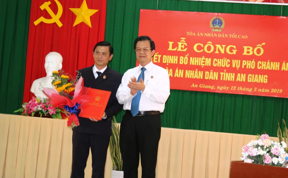 Chiều ngày 12-3, tại TAND tỉnh An Giang, ông Lê Hồng Quang (Phó Chánh án TAND Tối cao) đã trao quyết định bổ nhiệm Phó Chánh án TAND tỉnh này.