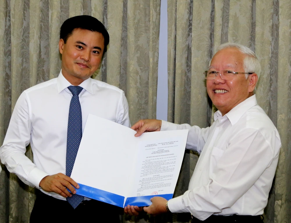 Phó Chủ tịch UBND TP.HCM Nguyễn Hữu Tín trao quyết định Giám đốc Sở GTVT TP.HCM cho ông Bùi Xuân Cường (trái) hôm 25-8. Ảnh: CTV.