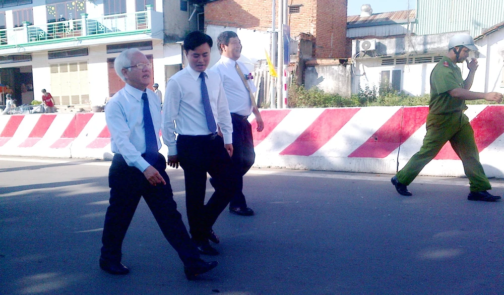 Chủ tịch UBND TP Lê Hoàng Quân và ông Bùi Xuân Cường (giữa) trong buổi khánh thành nút giao ngã tư Gò Dưa vào tháng 1-2012. Ảnh: MP