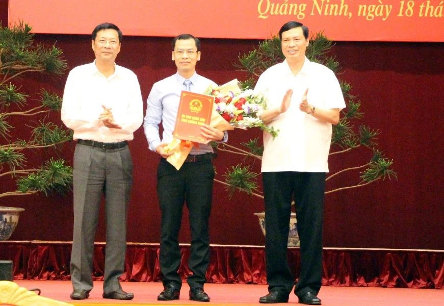 Lãnh đạo tỉnh Quảng Ninh trao quyết định bổ nhiệm và tặng hoa cho ông Phạm Hồng Biên. Ảnh: Báo QN