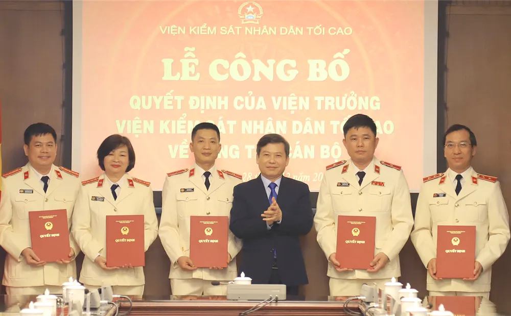 Viện trưởng VKSND Tối cao Lê Minh Trí (thứ 4 từ trái qua) trao quyết định bổ nhiệm cho các cán bộ. Ảnh: VKSND Tối cao