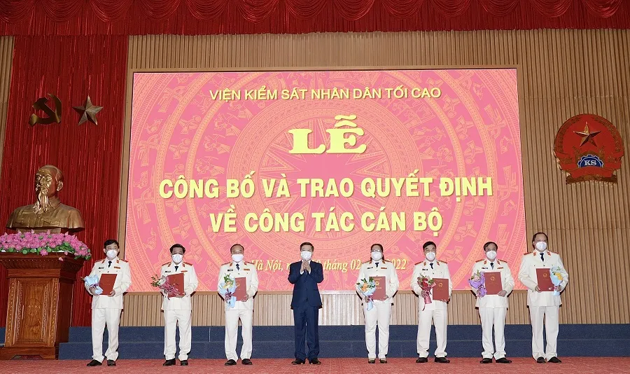 Sáng 10-2, VKSND Tối cao tổ chức lễ công bố, trao quyết định của Viện trưởng VKSND Tối cao về bổ nhiệm vụ trưởng Vụ Kiểm sát việc giải quyết các vụ án hành chính, vụ việc kinh doanh thương mại, lao động và những việc khác theo quy định của pháp luật (Vụ 10) và 6 chức danh kiểm sát viên (KSV) cao cấp.