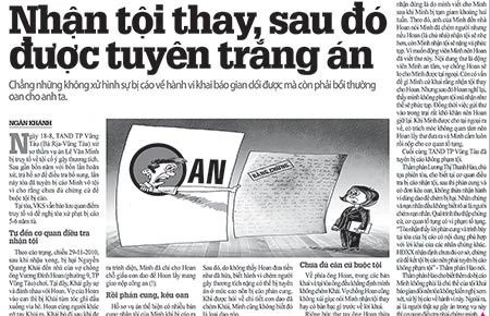 Trong bài báo nói trên có đăng ý kiến của TS Phan Anh Tuấn, Trưởng bộ môn Luật hình sự - ĐH Luật TP.HCM. TS Tuấn cho rằng không thể xử lý hình sự bị cáo về hành vi khai báo gian dối nhưng vẫn phải bồi thường oan cho bị cáo (khi bản án tuyên Minh vô tội có hiệu lực pháp luật).