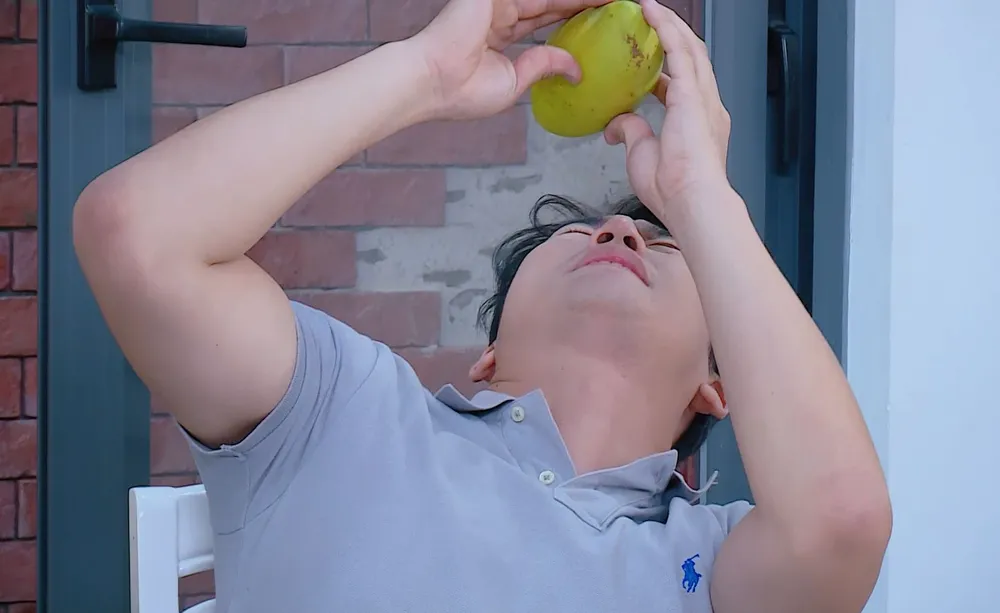 Nhân vật Hà Trí Quang lấy quả xoài và đưa lên mắt nhỏ mà không hề hay biết bị nhân vật Linh Tý chơi xấu. Ảnh: BEE