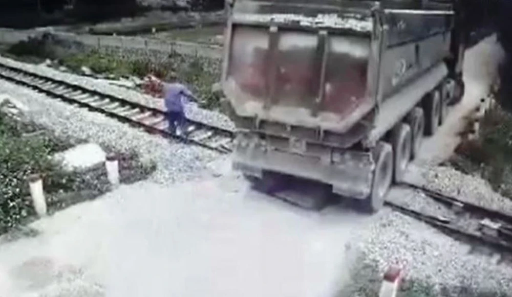 Đúng lúc này đoàn tàu hàng AH1 chạy hướng Hà Nội - TP.HCM đang lao tới.