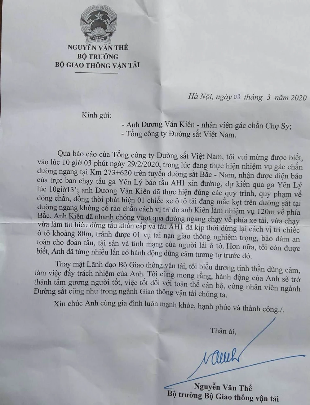 Ngày 3-3, Bộ trưởng Bộ GTVT Nguyễn Văn Thể gửi thư khen và biểu dương tinh thần dũng cảm, làm việc đầy trách nhiệm của anh Kiên.