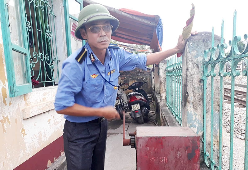 Ông Trần Văn Thành, nhân viên gác chắn tàu, đang thực hiện việc hạ gác chắn, sau khi kể lại giây phút kinh hoàng mà ông chưa bao giờ chứng kiến.