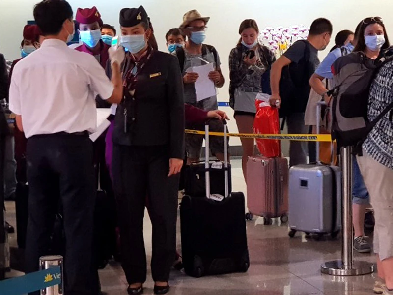 Nhân viên kiểm dịch đang theo dõi thân nhiệt du khách. Ảnh: TÂM NGUYỄN