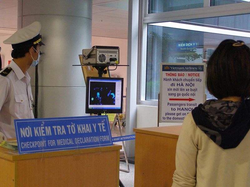 Nhân viên kiểm dịch kiểm tra tờ khai y tế của du khách. Ảnh: TÂM NGUYỄN