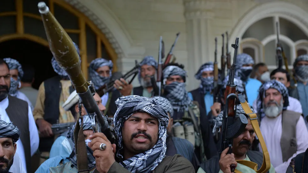 Lực lượng dân quân Afghanistan tập hợp vũ khí để hỗ trợ lực lượng quân đội chính phủ chống lại Taliban vào ngày 9-7. Ảnh: AFP
