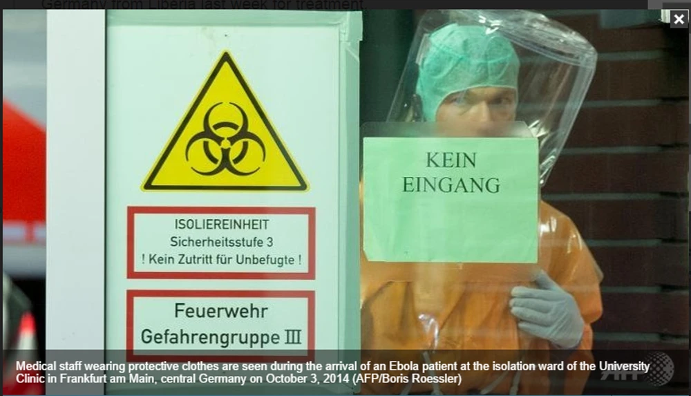 Các nhân viên y tế mặc quần áo chống bệnh Ebola trong suốt qua trình chữa trị cho một bệnh nhân Ebola tại một khu vực cách ly của trường Đại học Clinic ở Frankfurt am Main, miền trung nước Đức vào ngày 3-10 (AFP/Boris Roessler)