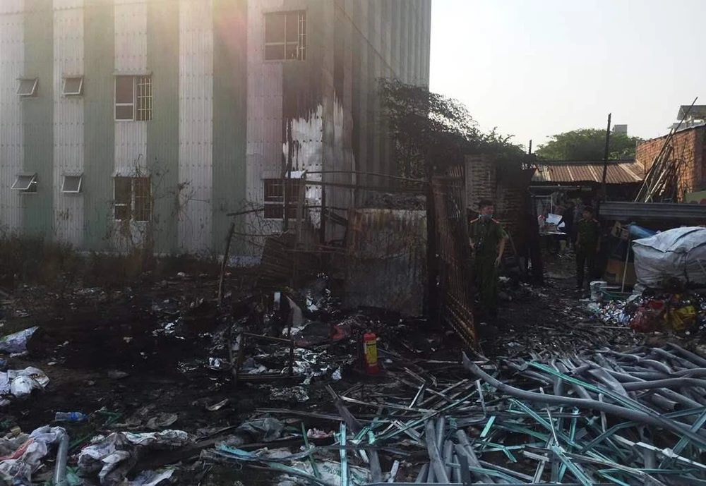Kho phế liệu bị thiêu rụi, vách ngân hàng bị cháy xém. Ảnh: H.H