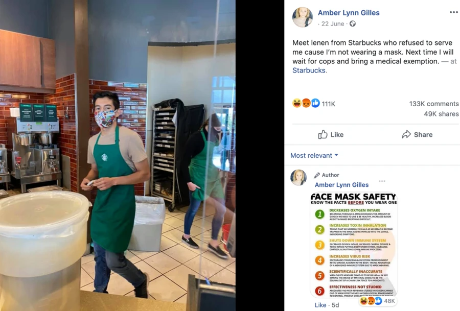 "Lenin ở quán Starbucks, người đã từ chối phục vụ tôi vì tôi không đeo khẩu trang. Lần tới tôi sẽ gọi cảnh sát mang giấy chứng nhận sức khỏe đến" - Gilles đăng trên Facebook.