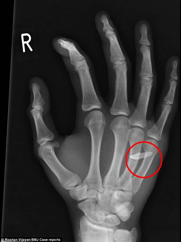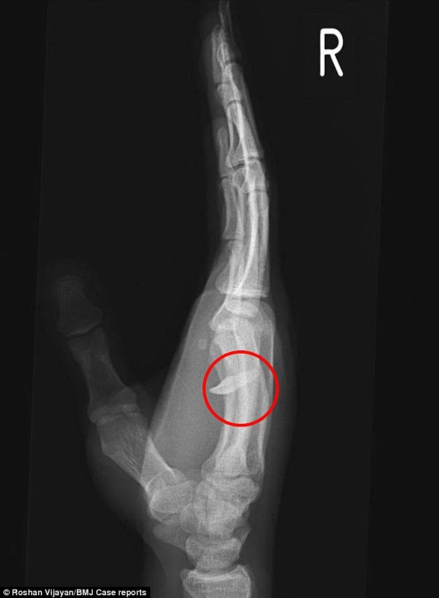 Bác sĩ chẩn đoán anh bị nhiễm trùng do một vết cắn và yêu cầu chụp X-quang. Ngay sau đó, họ sửng sốt khi phát hiện ra cả một chiếc răng người găm vào bàn tay của người thanh niên.