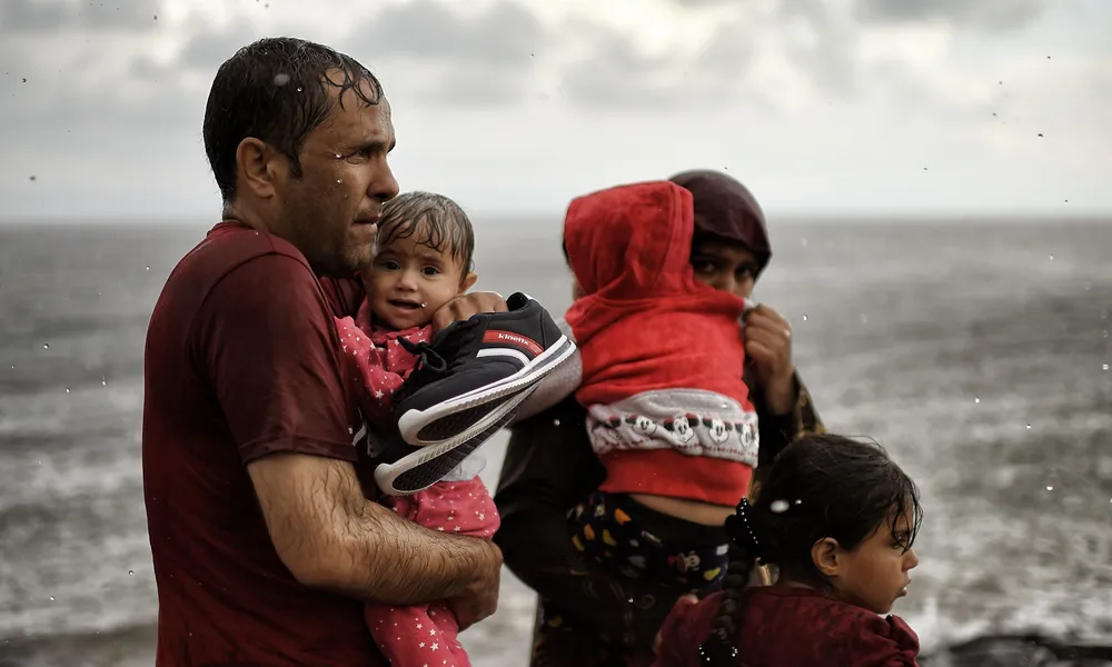 Một gia đình người tị nạn Syria đã đến được bờ biển của đảo Lesbos, Hy Lạp. (Ảnh: Aris Messinis/AFP/Getty Images)