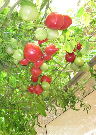 Trên trần phòng họp là giàn cà chua đã ra quả chín đỏ mọng.