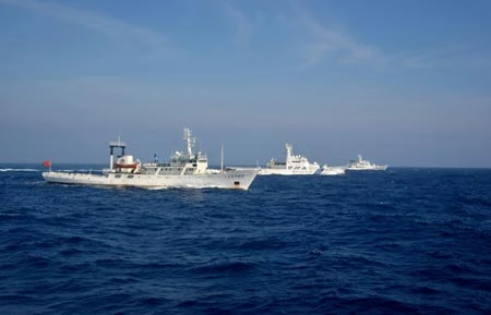 Tàu Trung Quốc và Nhật Bản đối đầu nhau vào tháng 7-2012 trên vùng biển gần quần đảo Senkaku (mà Trung Quốc gọi là Điếu Ngư) (Ảnh: Tân Hoa Xã)